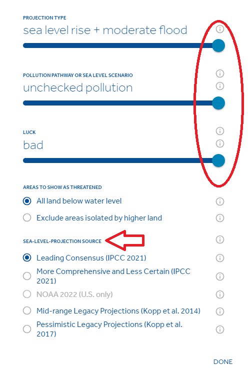 해수면 상승 피해 지역 지도가 어떤 자료를 바탕으로 제작되었는지 궁금하신 분들은 "SEA- LEVEL PROJECTION SOURCE"를 확인해보세요. 저는 국제기후변화협회 자료를 기반으로 확인하고 싶어서 Leading Consensus(IPCC 2021)를 선택했습니다.